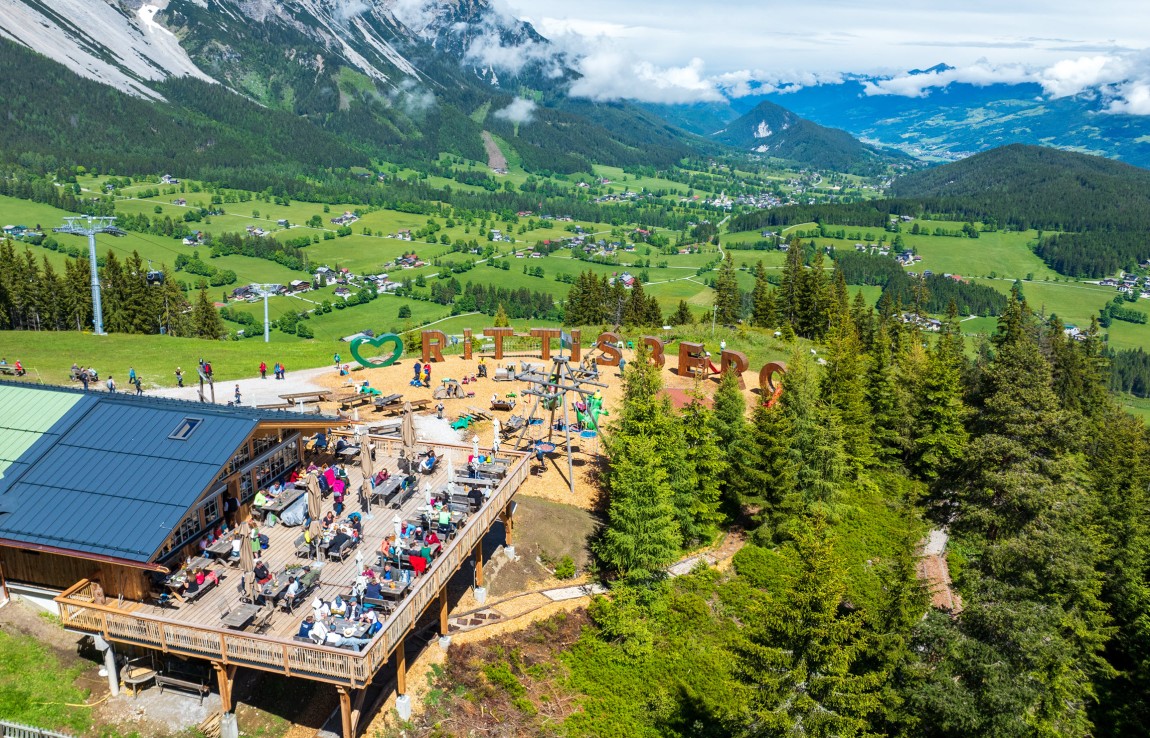 Genussinsel in luftiger Höhe: Am Rittisstadl genießt du regionale Spezialitäten und eine atemberaubende Aussicht auf der großen Sonnenterrasse.
