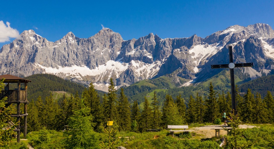 Der Gipfelrundwanderweg startet an der Bergstation der Rittisbergbahn auf 1500 Metern Seehöhe. Du wanderst am Rittisstadl vorbei Richtung Südosten und folgst der Beschilderung „Gipfelkreuz“. Die Route führt über eine breite Forststraße und einen Waldweg direkt zum Gipfel. Wenn du einen geländetauglichen Kinderwagen dabei hast, bleibst du auf der Forststraße. Auch sie führt bis auf den Gipfel. Auf 1582 Höhenmetern befinden sich das Gipfelkreuz und ein Aussichtsturm. Dort genießt du den atemberaubenden Blick auf das Dachsteinmassiv, die Schladminger Tauern und den Hochkönig bis hin zum Großglockner. Am Rückweg passierst du einen zweiten Aussichtspunkt, der sich in einer Kehre mit Sitzgelegenheiten befindet. Nach gut einer Stunde hast du den Gipfel umrundet und kommst zurück an den Ausgangspunkt. Dort befinden sich der Höhenspielplatz „I love Rittisberg“ mit dem angrenzenden Themenwanderweg „Auerhuhn“. Der Barfußweg befindet sich neben dem Rittisstadl.