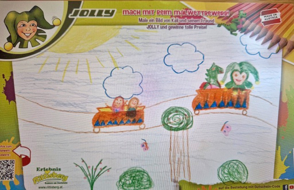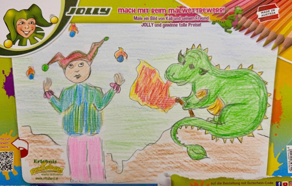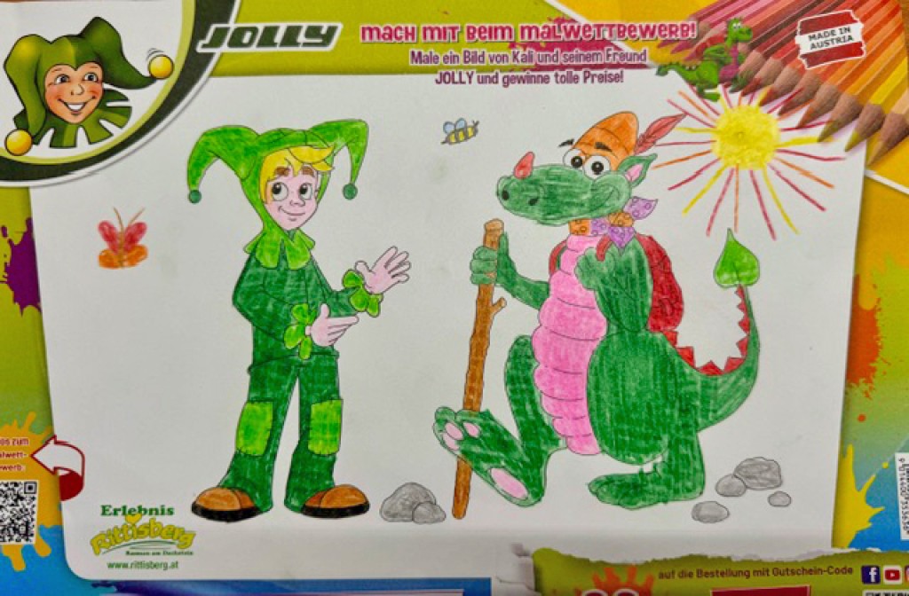 - Um am Gewinnspiel teilzunehmen, sende uns deine JOLLY-Zeichnung mit Kali und seinem Freund JOLLY zu, per Post, E-Mail oder gib sie an der Kassa der Talstation Rittisberg oder im Dachsteinbad Ramsau mit deiner Adresse ab.